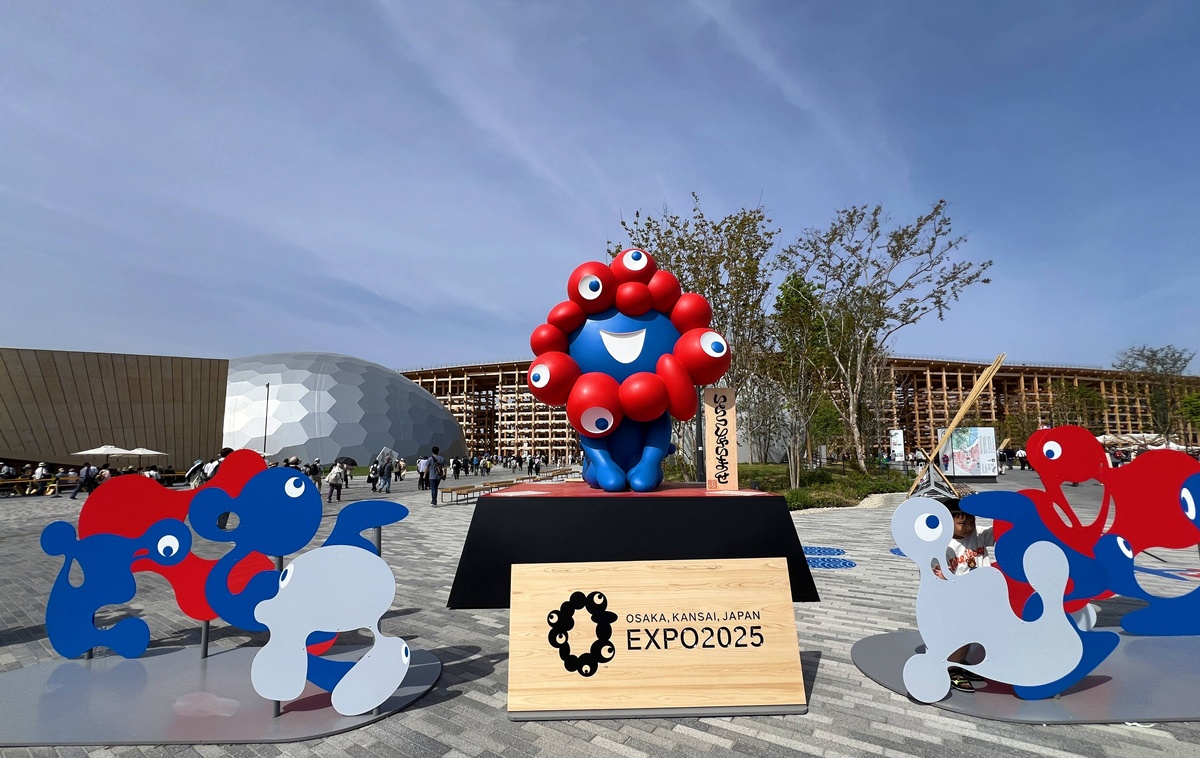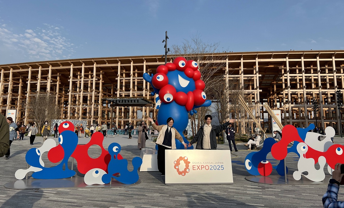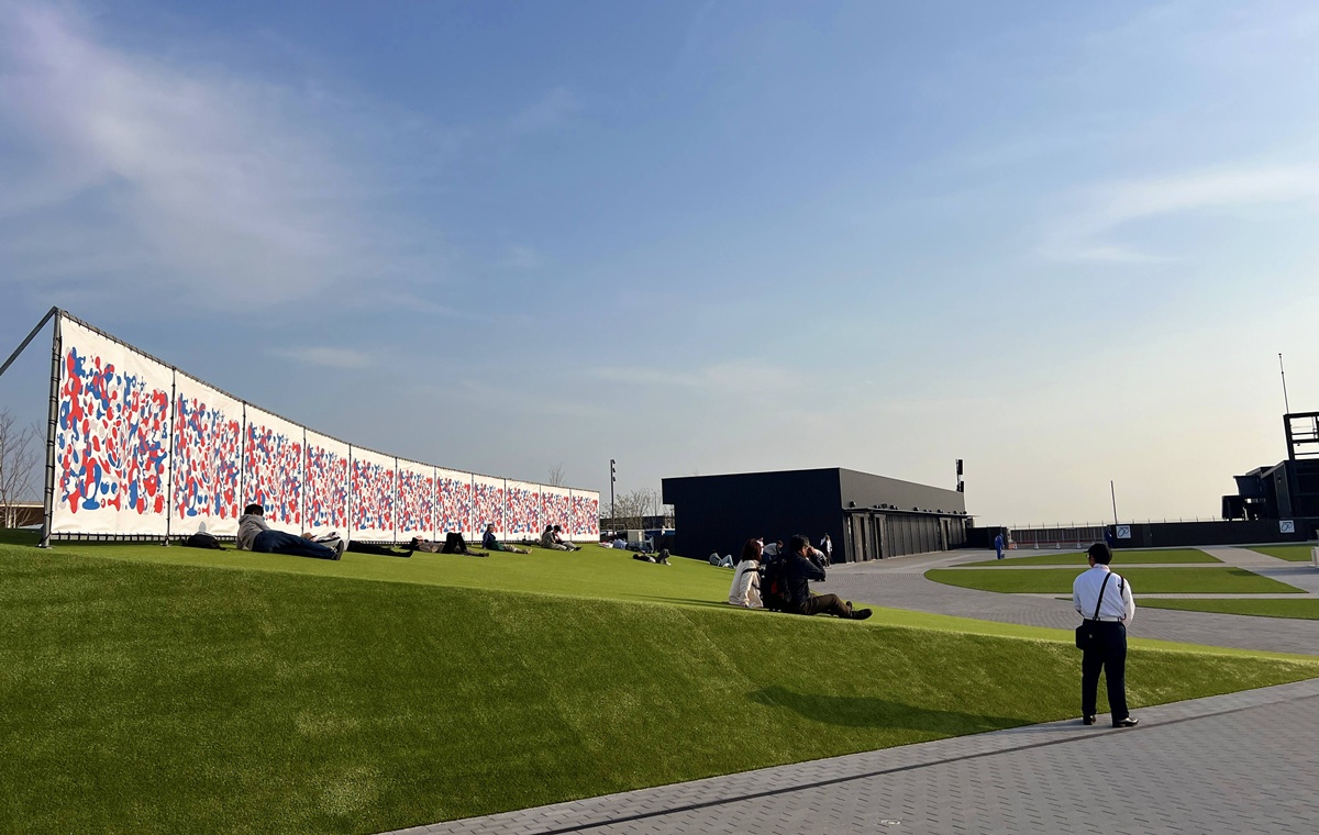 東入口廣場有許多值得拍照的裝置藝術與造型座椅,不過備受注目的當然是EXPO2025吉祥物脈脈的迎賓合影處,同時還能一次將與大屋根拍入畫面,無論日夜都大排長龍。