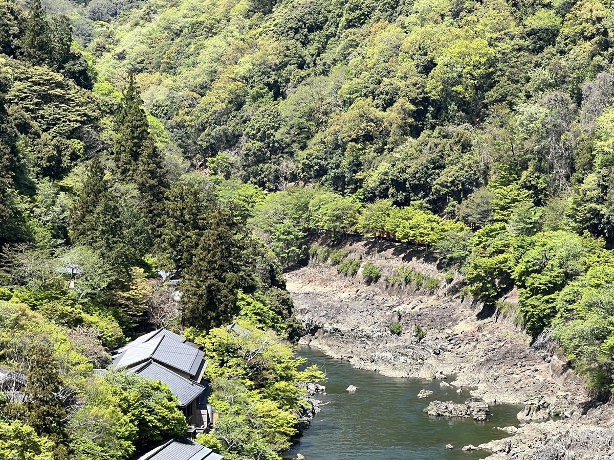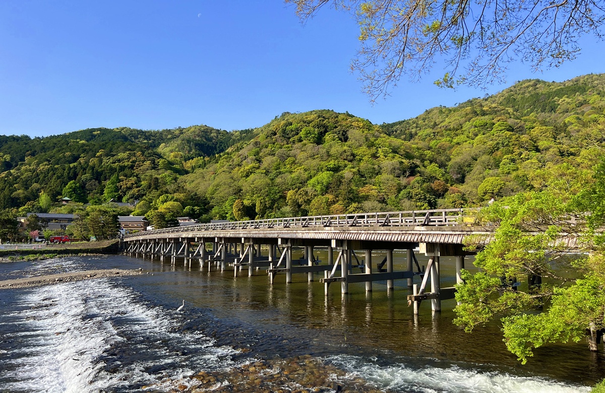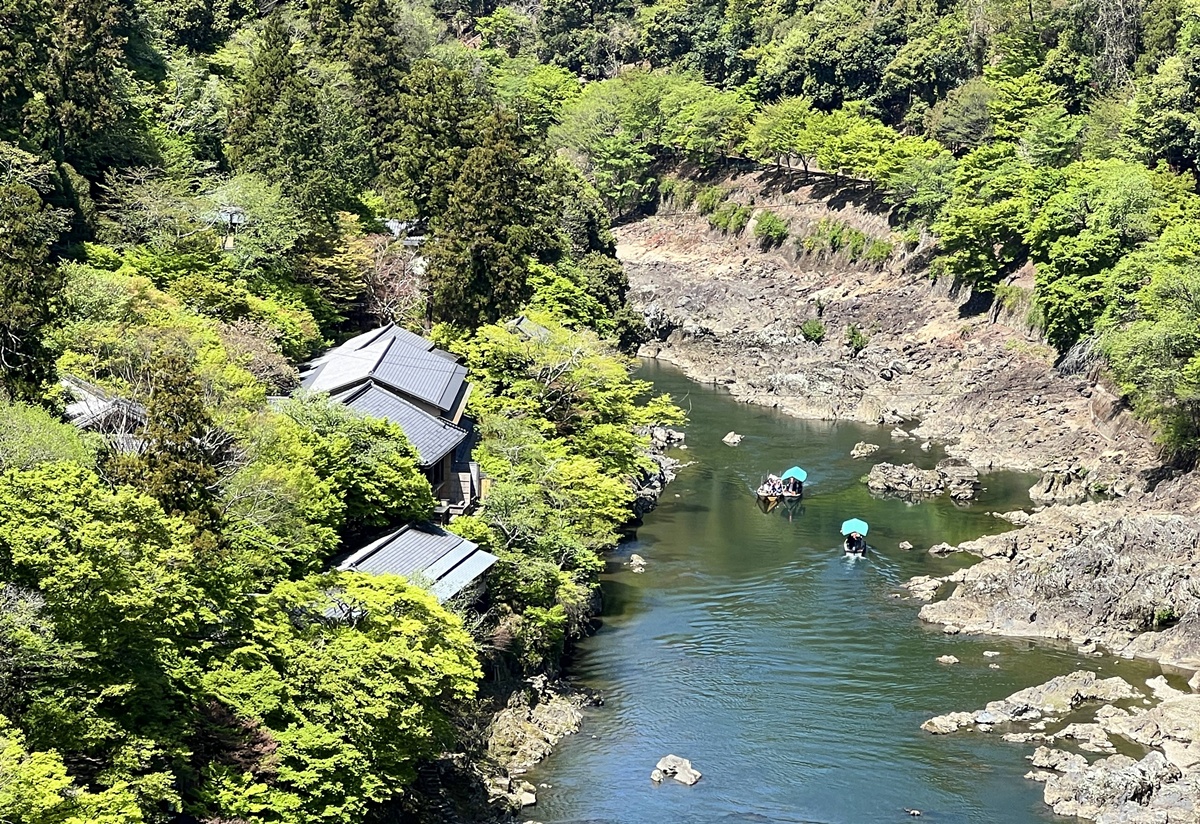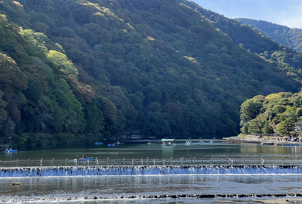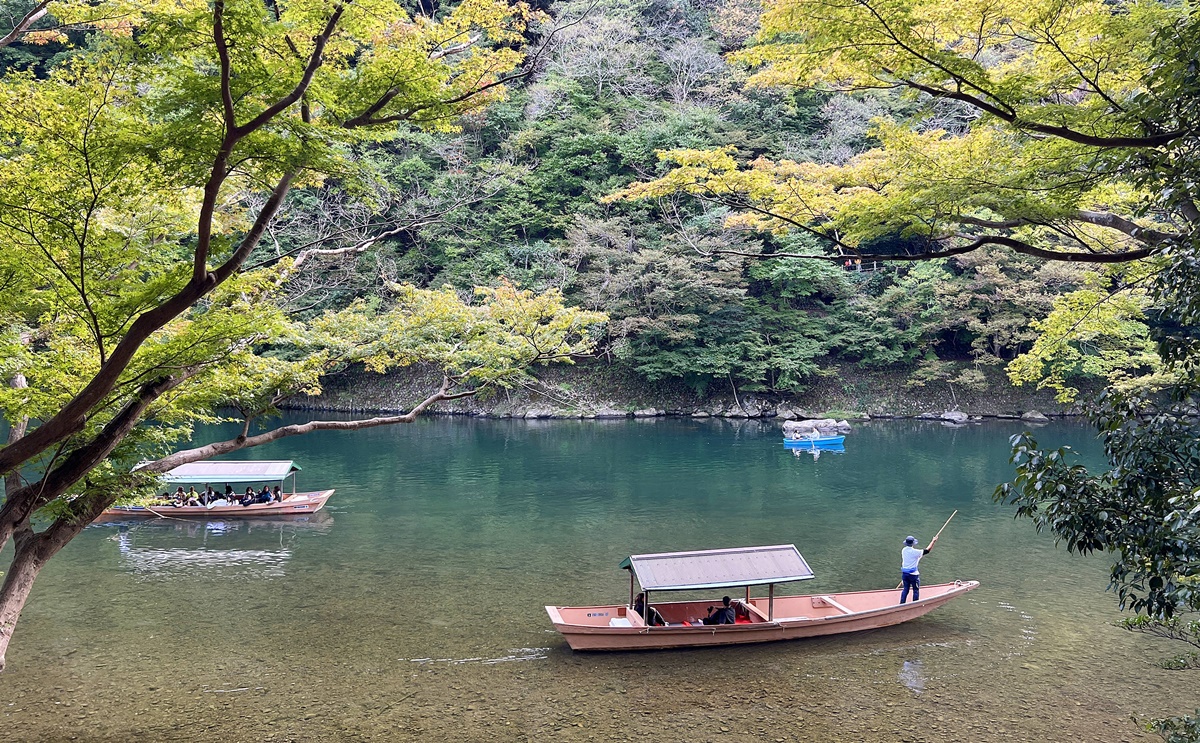 嵐峽壯麗的山巒景色,河面上倒映著綠與山,船舟偶爾輕輕滑過,為保津川水域,增添了一絲動感,一陣風從河谷湧上,掠過樹梢的,與嵯峨野小火車進山時那聲悠長汽笛,混合成一種京都嵐山專屬BGM(背景音樂)