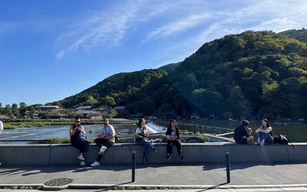 在嵐山行走,眼前的綠色天幕彷彿為你打開了一扇通向大自然的門,空氣中,瀰漫來自保津川峽谷的清涼氣息、桂川的水流聲在耳邊環繞,沿著溪畔的平緩散步道,能看到有人在喝咖啡、逗鴨攝影、划船戲水,甚至在寫生,即便酷暑難耐,嵐山依舊保持著一份清爽,讓人感受到與大自然的緊密聯繫。或許,在嵐山觀光人潮高居不下的時代,只剩下嵐山公園還守著一方靜謐吧。