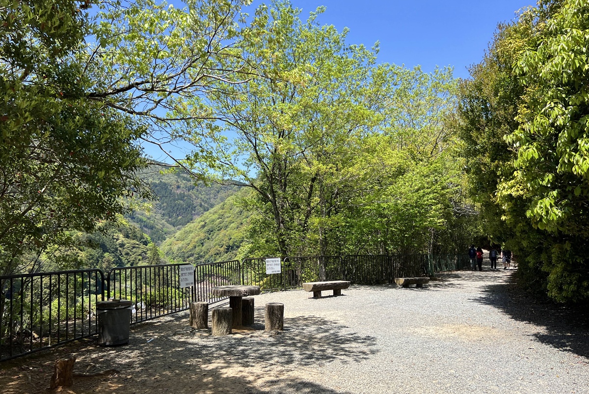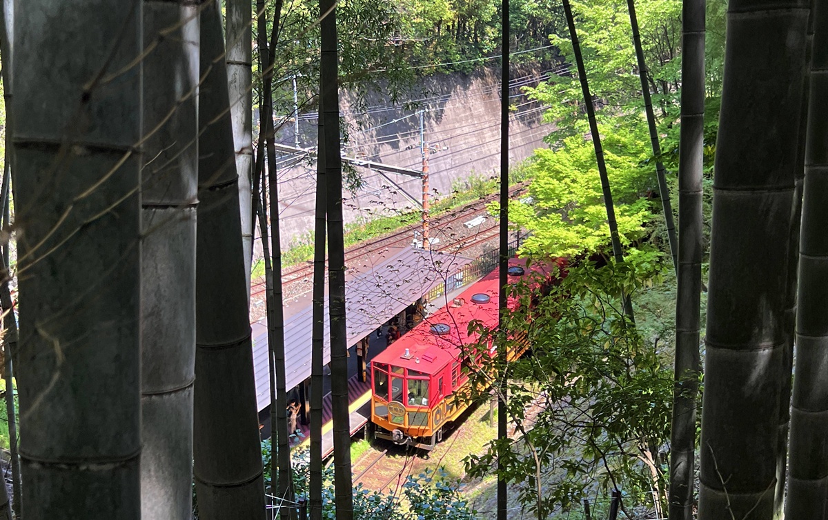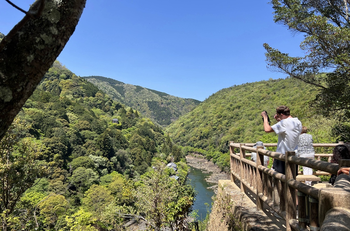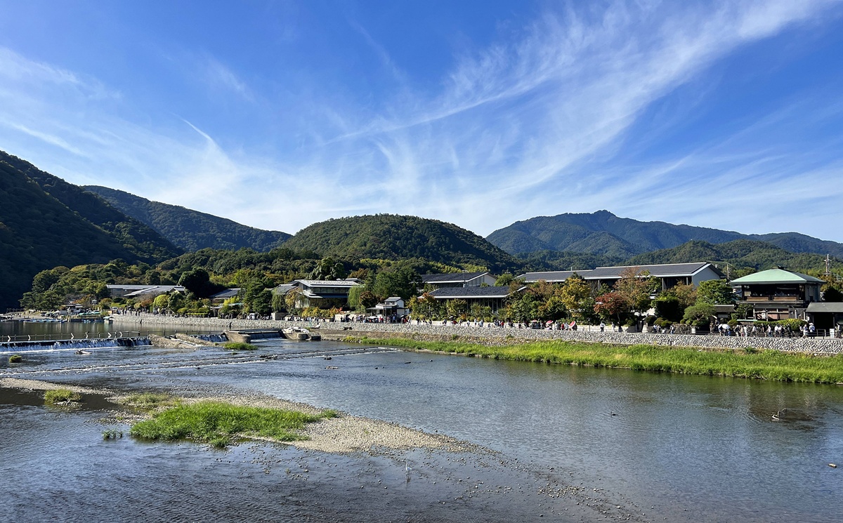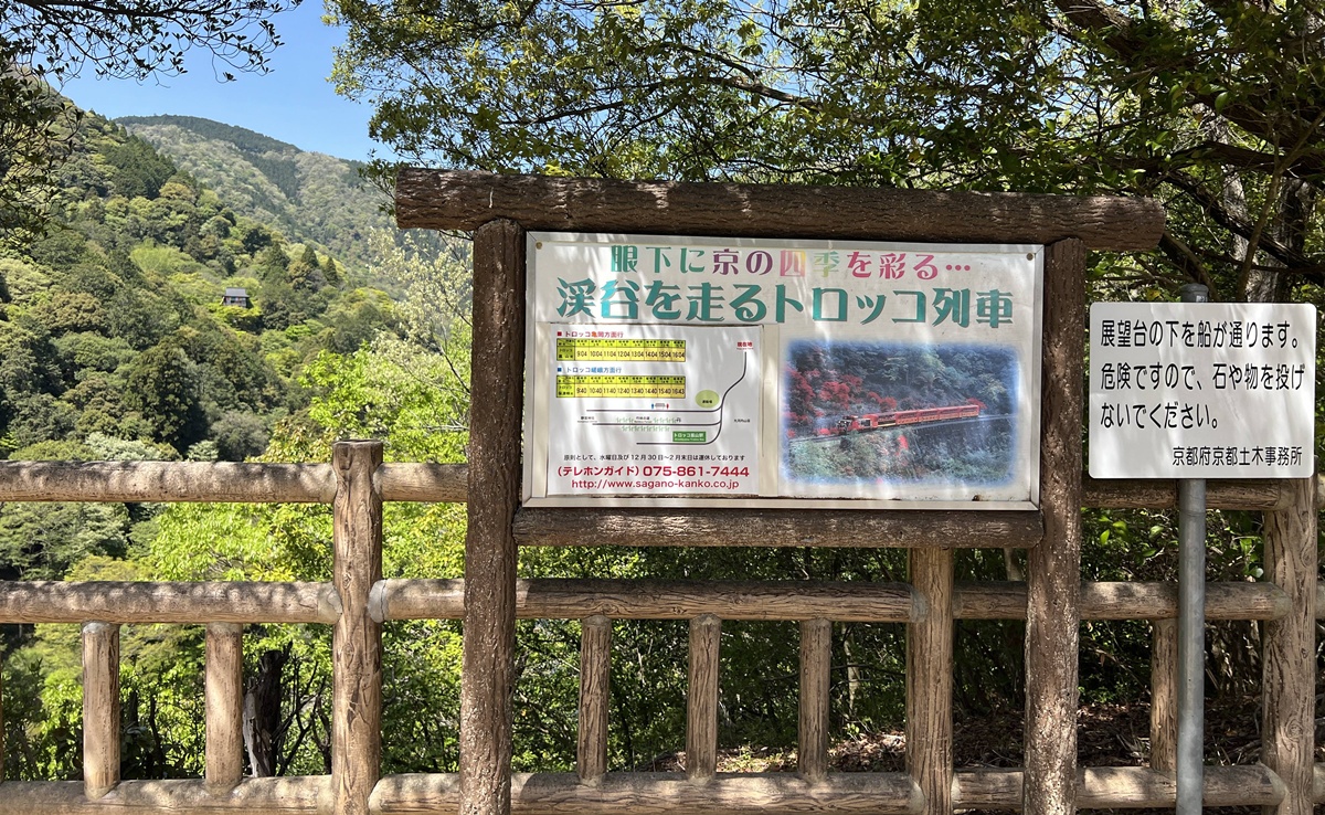 嵐峽展望台位於嵐山公園龜山地區曾是天龍寺的寺領,也是平安貴族的郊遊勝地,文獻記載多位和歌詩人喜愛登此高地賞景,同時龜山地區本與禪宗精神有連結,與天龍寺本為一體,某種程度上,這裡是延續禪庭靜觀的戶外版冥想場。儘管地勢不高,卻因位於保津川轉彎處高地,視野範圍幾乎可以360°環抱嵐山:桂川、遊船、山谷、甚至嵯峨野觀光小火車,都能盡收眼底。