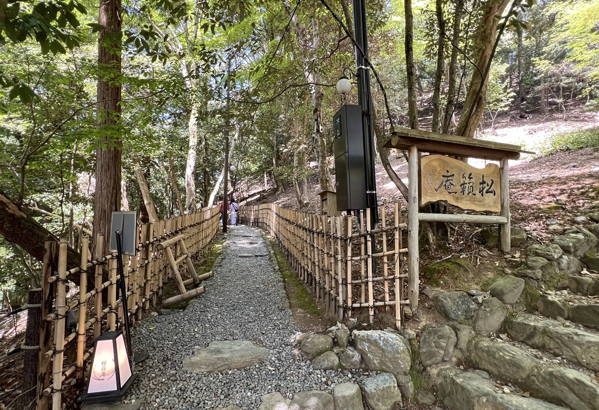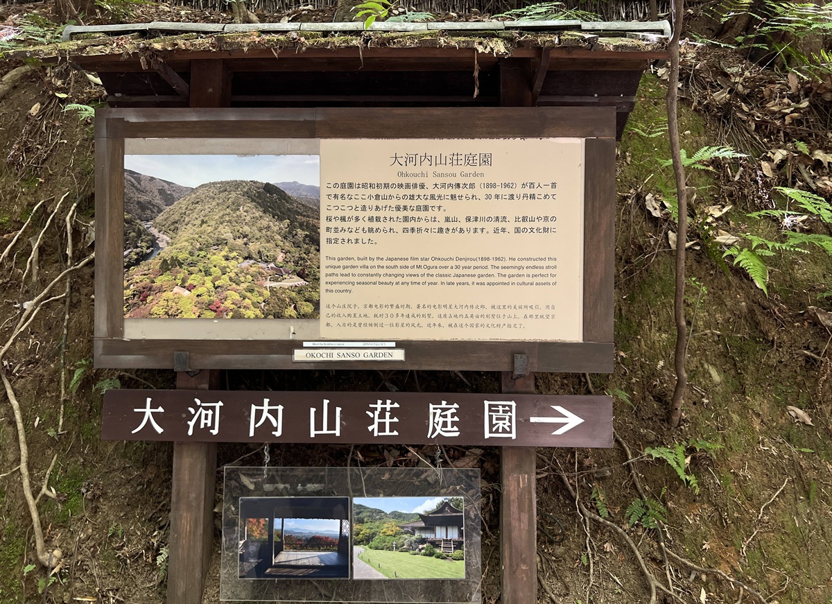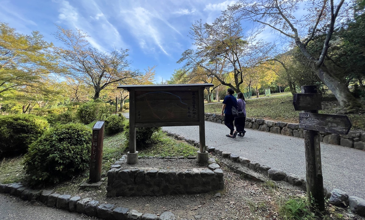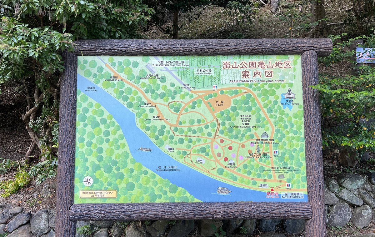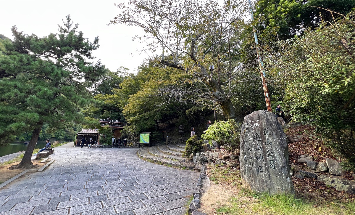 下次想看看不一樣的嵐山全景嗎?不妨順著清澈的桂川溪畔悠然前行,直到看到古樸的日式家庭料理餐廳-龜山家,你便能發現標誌著「嵐山公園龜山地區」的石碑,繼續走下去,就會找到了。