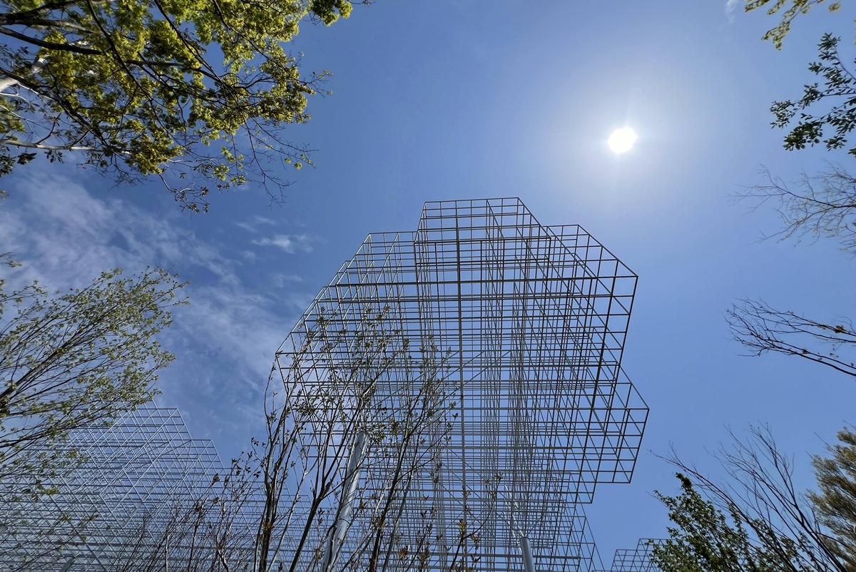 《Better Co-Being》摒棄了常見的牆壁或天花板,而是由一個四層銀色網格狀頂篷構成,高11米,僅由纖細的柱子支撐,由於精心設計的連接,頂篷彷彿雲朵般飄浮。