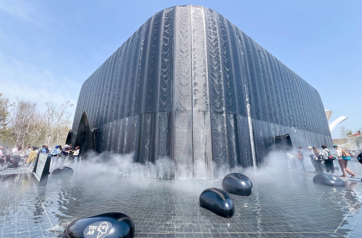 《Future of Life/いのちの未来》建築外型被塑造成巨大的體塊從地面拔地而起,被水覆蓋的波光粼粼,一如正在雕琢地球這片土地的活力。石黑浩教授認為:「人類最初是從無機物演化為有機體。現在,我們正試圖利用科技的力量,進化為新的無機形式」。