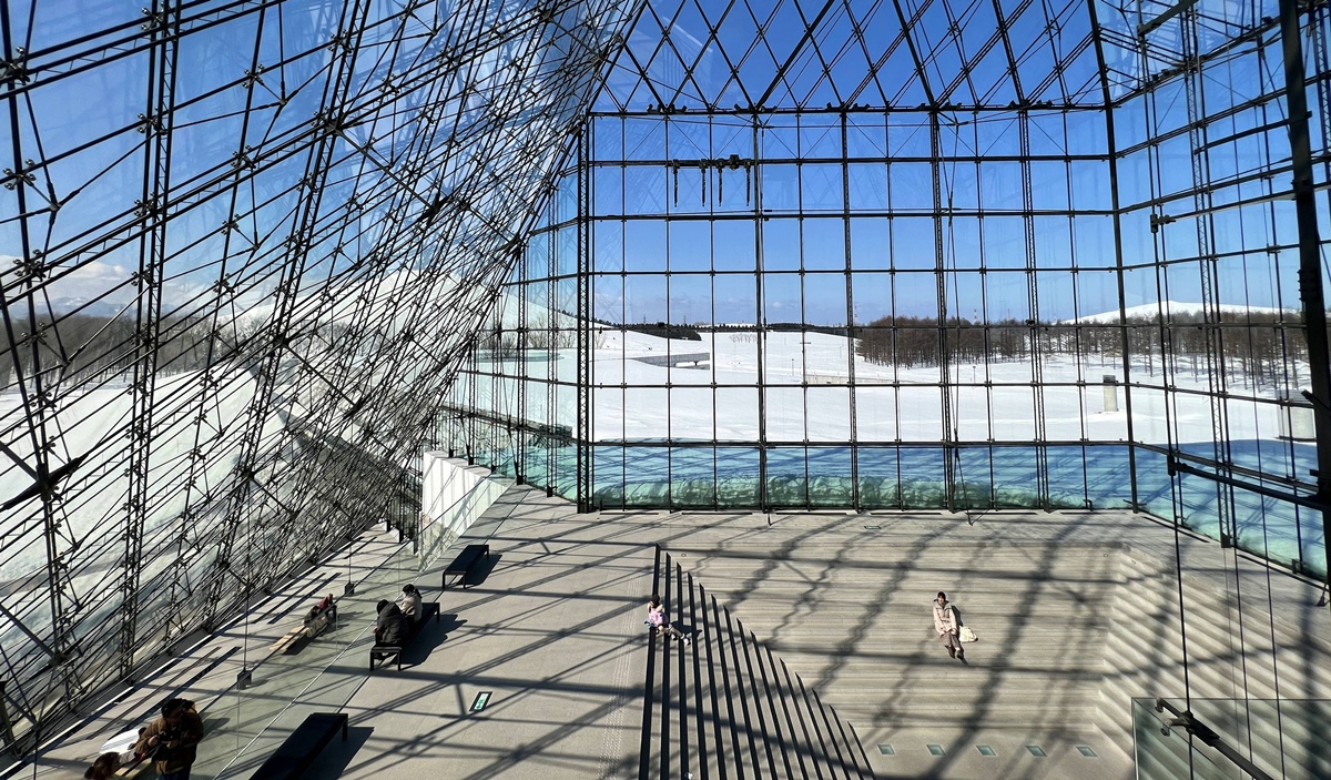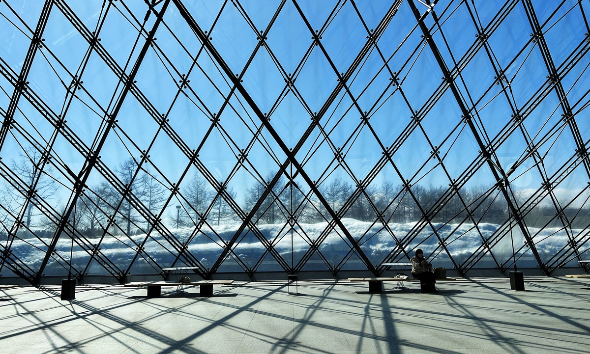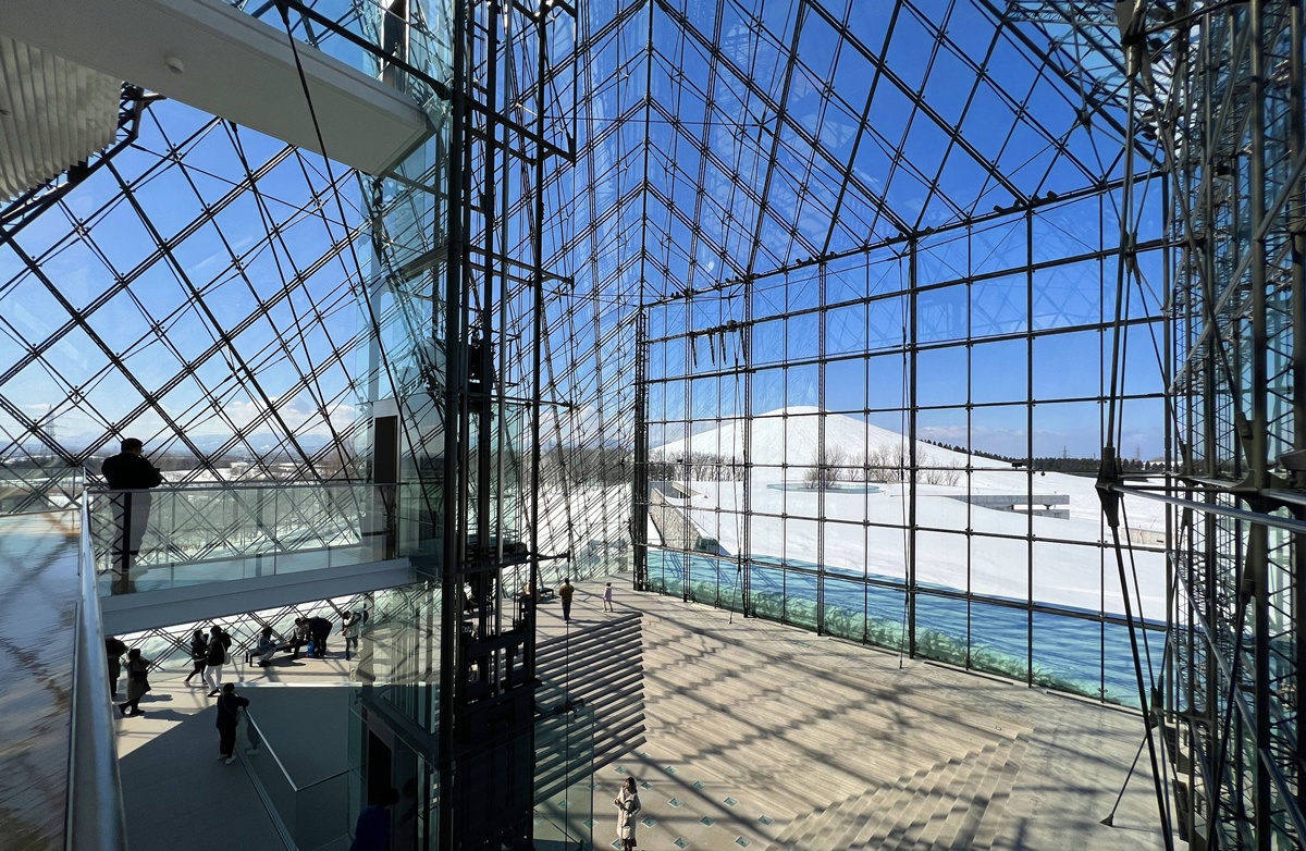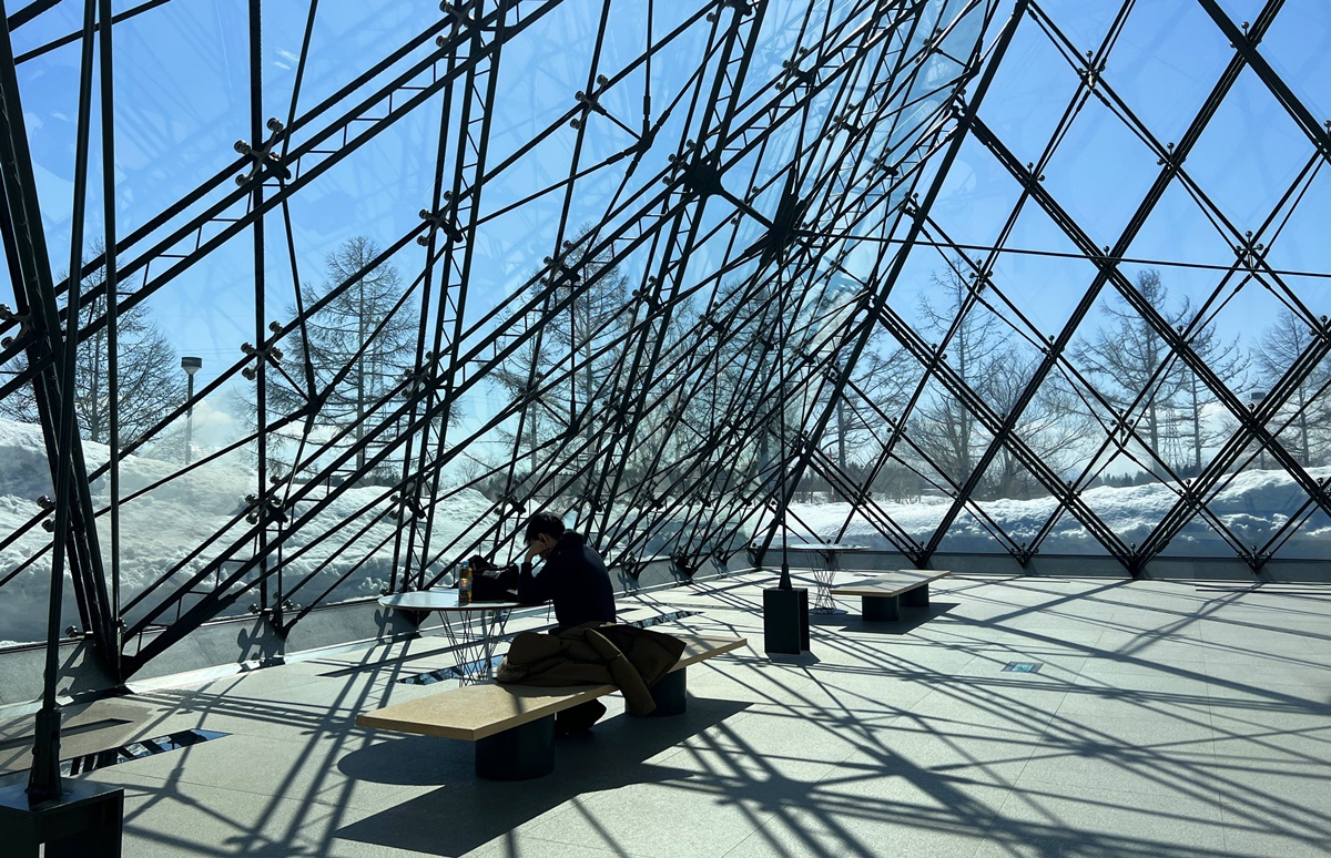 遠處看見玻璃金字塔(Glass Pyramid – HIDAMARI),晶瑩剔透的結構在雪地閃耀,像是一座未來感十足的宮殿;他是園內最大建築,作為一個多功能建築空間,建築內部包含展覽空間、咖啡廳、禮品店和觀景台,內部溫暖開闊,玻璃的透光性使得陽光與雪景自由穿透入室,如畫般展現在眼前,不只是入內參觀者,也有不少在此閱讀、工作的人,我跟著坐著坐著,實在也不願離開了。