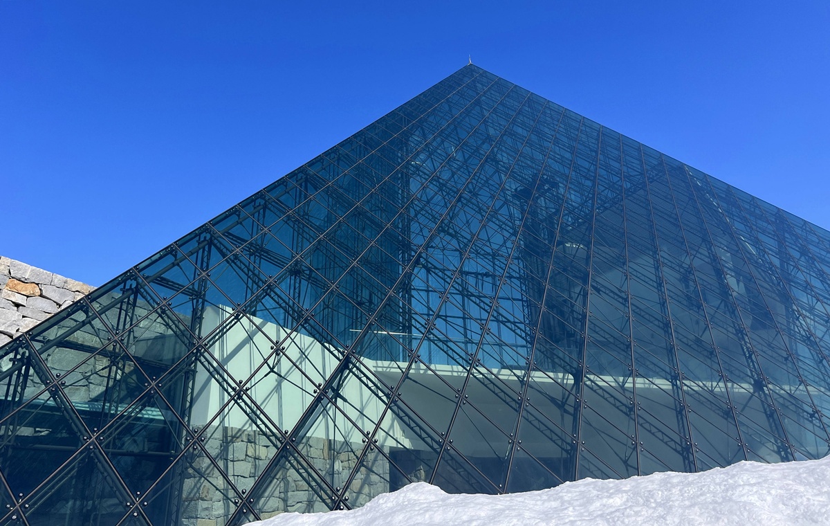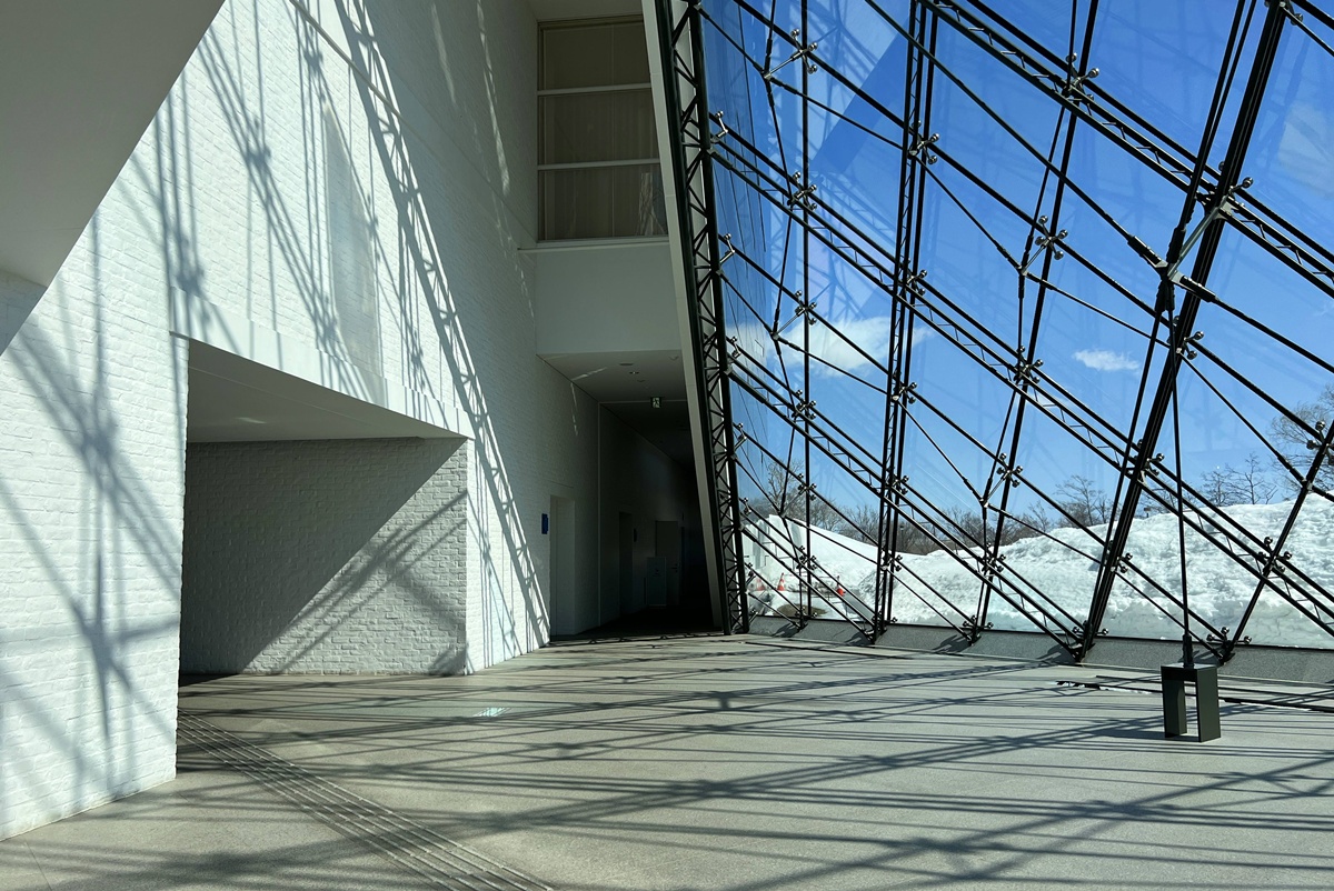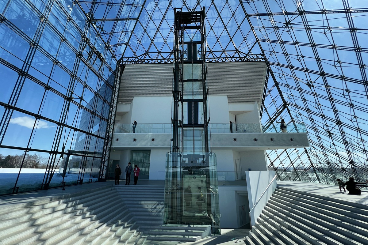 遠處看見玻璃金字塔(Glass Pyramid – HIDAMARI),晶瑩剔透的結構在雪地閃耀,像是一座未來感十足的宮殿;他是園內最大建築,作為一個多功能建築空間,建築內部包含展覽空間、咖啡廳、禮品店和觀景台,內部溫暖開闊,玻璃的透光性使得陽光與雪景自由穿透入室,如畫般展現在眼前,不只是入內參觀者,也有不少在此閱讀、工作的人,我跟著坐著坐著,實在也不願離開了。