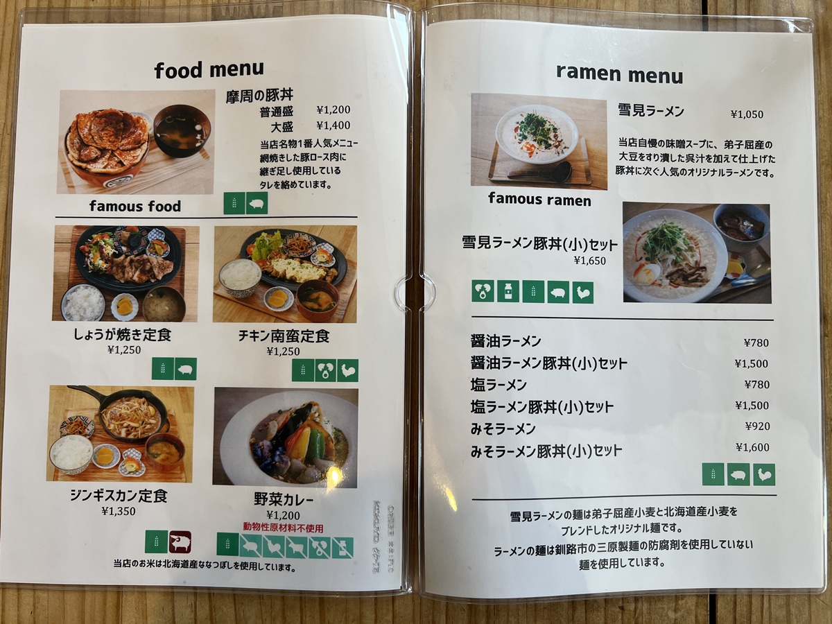 食堂と喫茶 poppotei 以使用當地食材製作的料理聞名,北海道產A級米ななつぼし與釧路三原地麵條,主要供應各種拉麵、定食蓋飯、咖哩飯、南蠻炸雞定食與成吉思汗烤羊肉定食等平易近人的日式家常料理,最受歡迎的是使用北海道產豬里脊肉-摩周豚製作的摩周豬肉蓋飯,厚切豬里脊炙烤得恰到好處,搭配秘製醬汁烤製,口感鮮嫩,醬汁收得濃郁又不膩,白飯吸飽肉汁,是弟子屈居民口中的定番午餐。