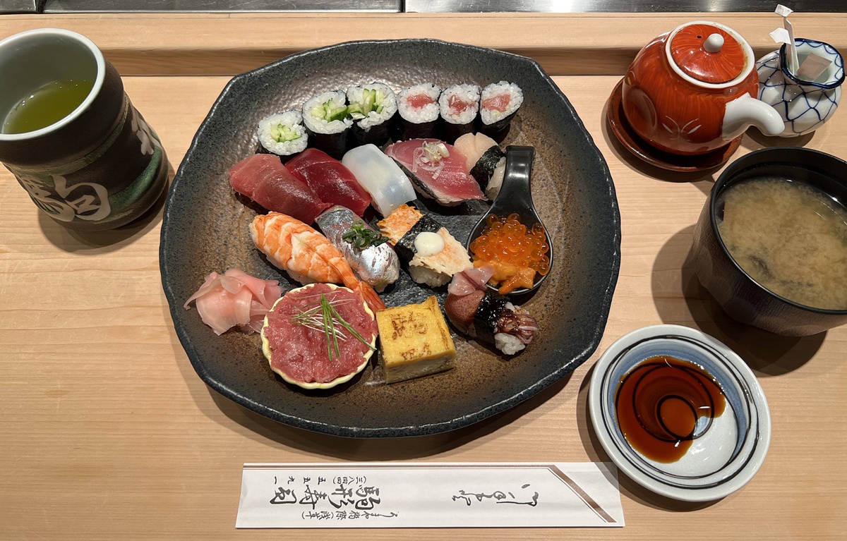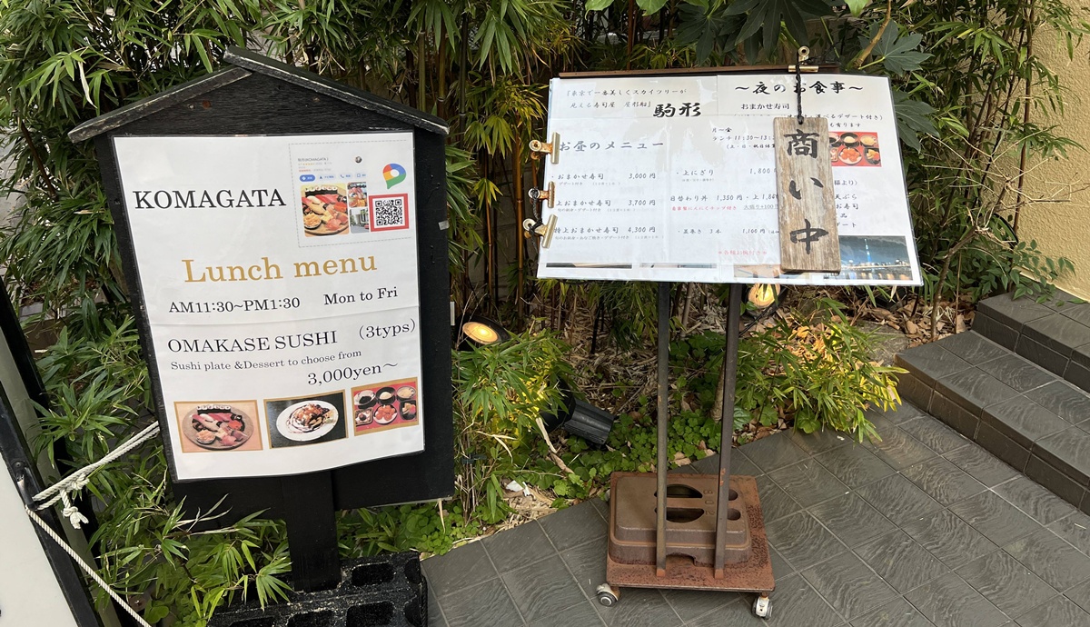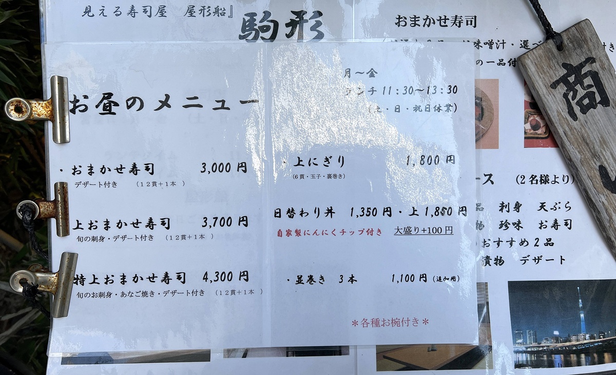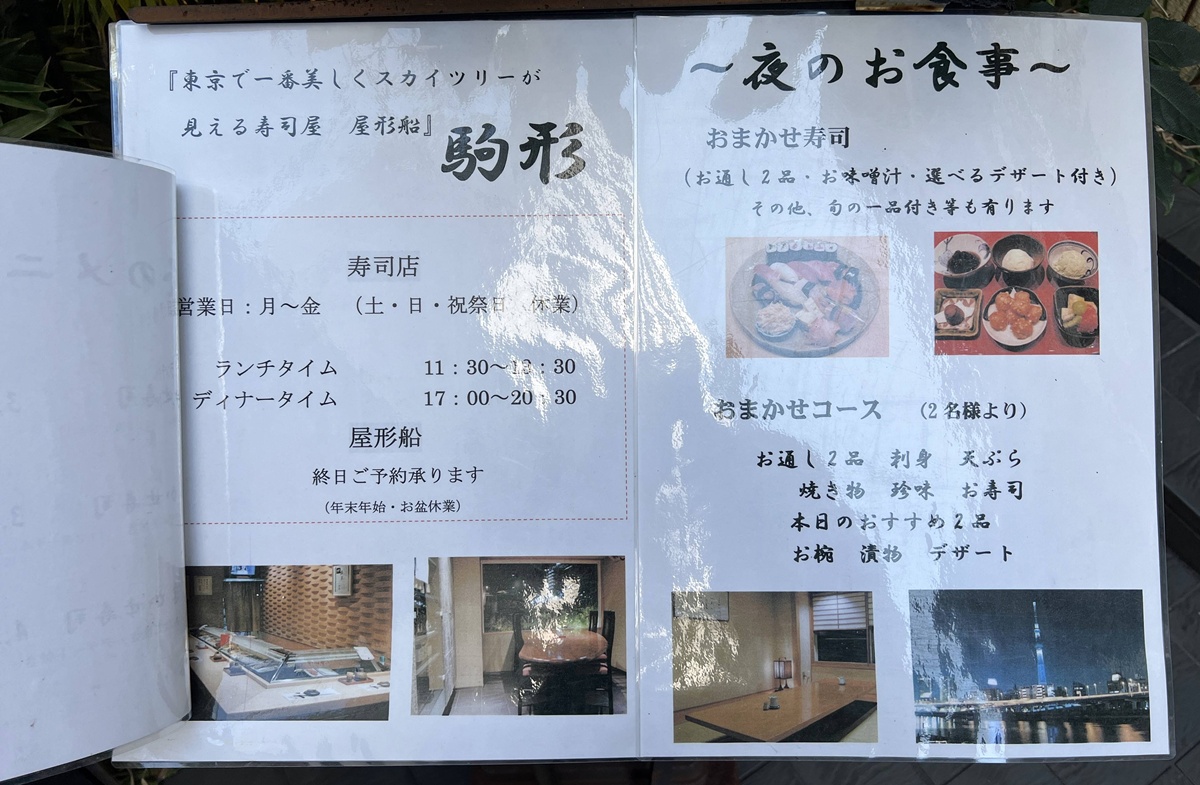 午餐時段是11:30-13:30,使用當日當季的時令魚製作的壽司,供應主廚精選壽司拼盤2900日圓、精選優質壽司拼盤 3500日圓、特色壽司拼盤4100日圓(未稅),並包含味噌湯和飯後甜點;晚餐時段則是17:30-21:30,主要供應7600日圓、8600日圓、9600日圓的壽司套餐,需提前預約,可使用信用卡,也有提供固定套餐3100日圓和駒形套餐2500日圓。