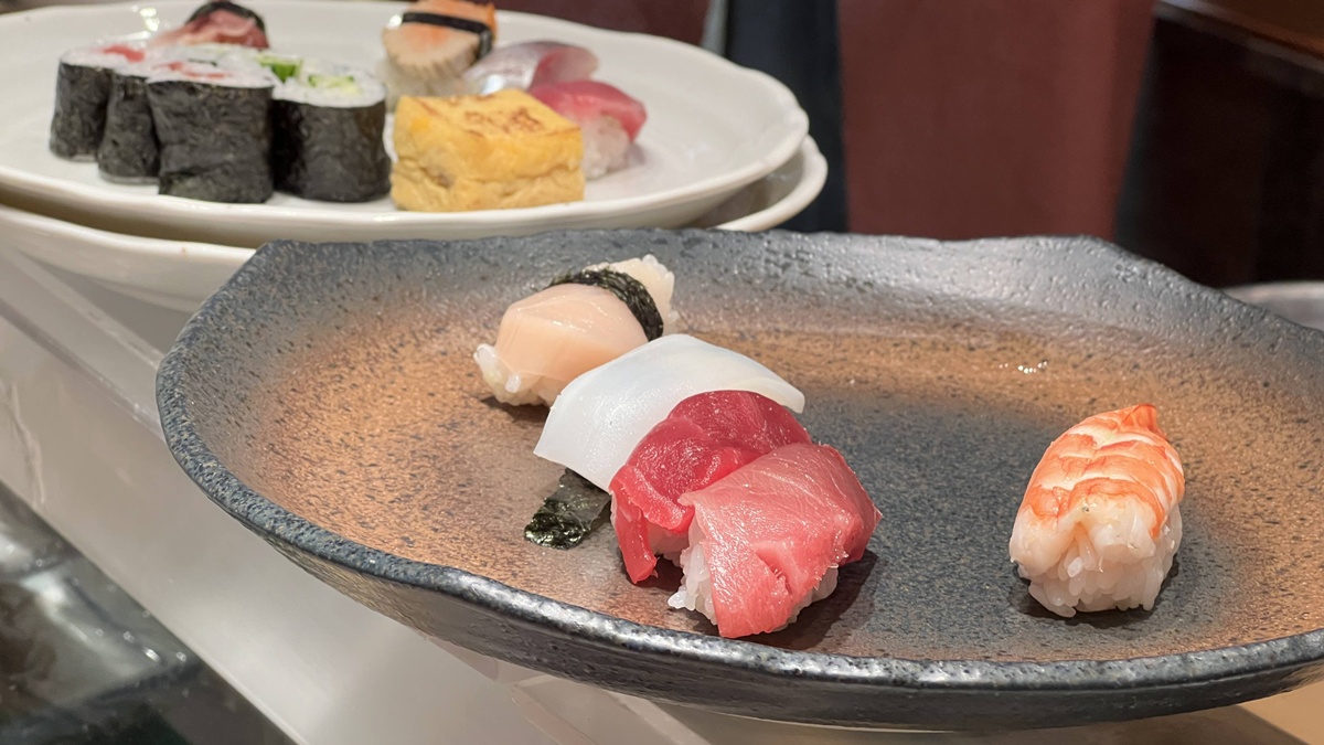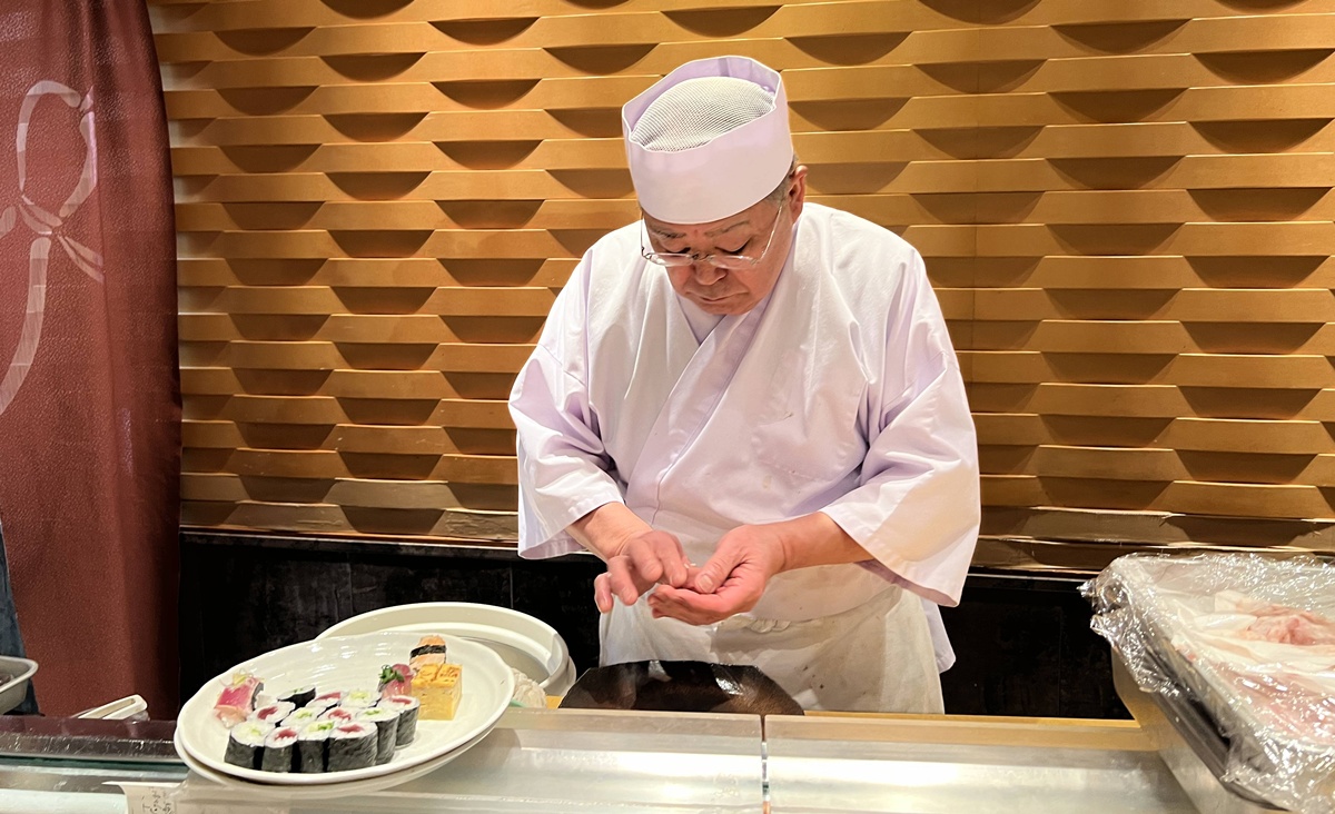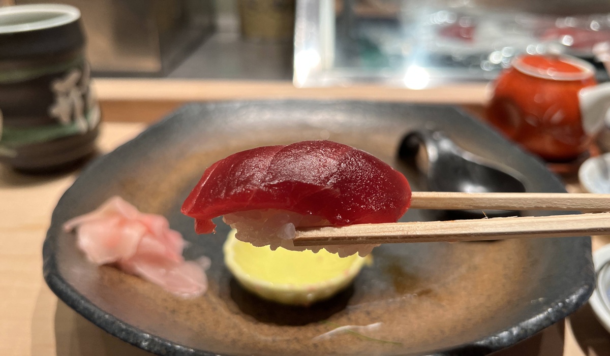 師傅先在木桶上輕輕一拍,像是替米粒喚醒氣息,輕輕用指尖捏握成形,接著從木箱取出鮪魚片,蓋在米心上,再用指尖把魚片輕柔貼合,手心不著痕跡地帶出溫度,看似簡單的動作,卻包含無數練習:力道要讓米粒結合又不過度壓緊,魚料要貼服卻不失彈性。