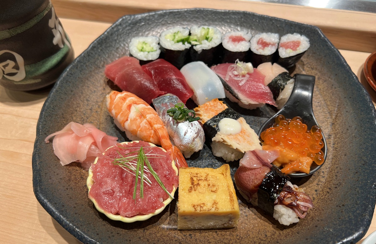 我淺淺用英文詢問一個人是否能用餐,師傅沉穩又認真地以英文回覆我,當然沒問題。簡單點了午間套餐,師傅先是專注把壽司完成,在我一邊品嘗時,一邊願意用簡單的英文和我交流,講述壽司的溫度、米飯酸度與魚料產地來源。