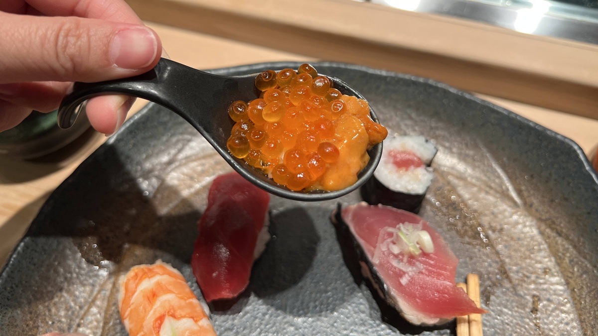 而今天的午餐,我認得的有鮪魚、槍烏賊 、蝦、干貝、玉子燒、鮪魚卷、黃瓜卷,還有4-5種我記不得名字的時令魚種(請見諒我對魚類的英文詞彙有限),師傅特別推薦一口吃下去的鮭魚卵海膽和鮪魚泥最中,是最令我驚豔的創意風味!